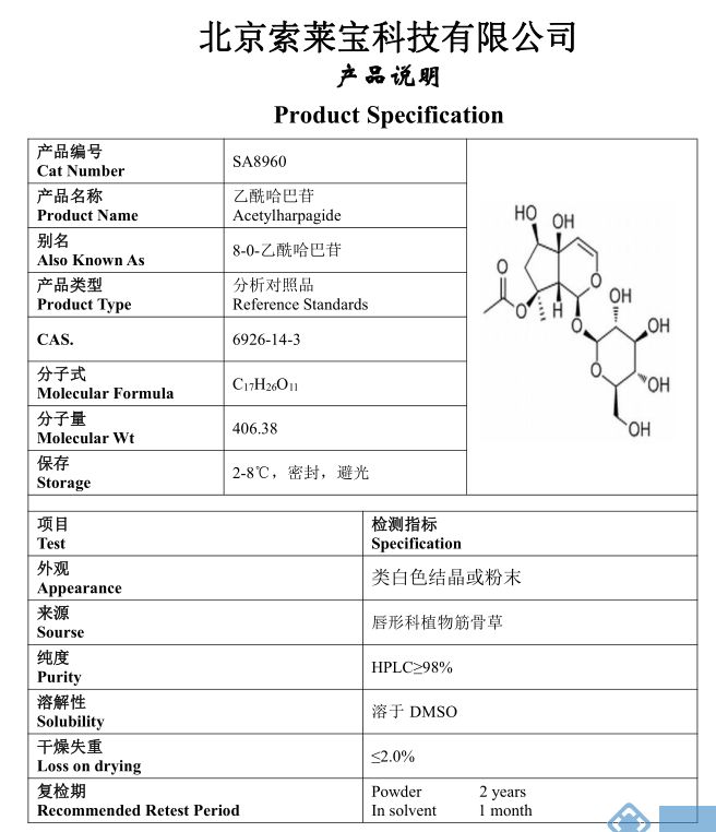 产品名称: Acetylharpagide;乙酰哈巴苷